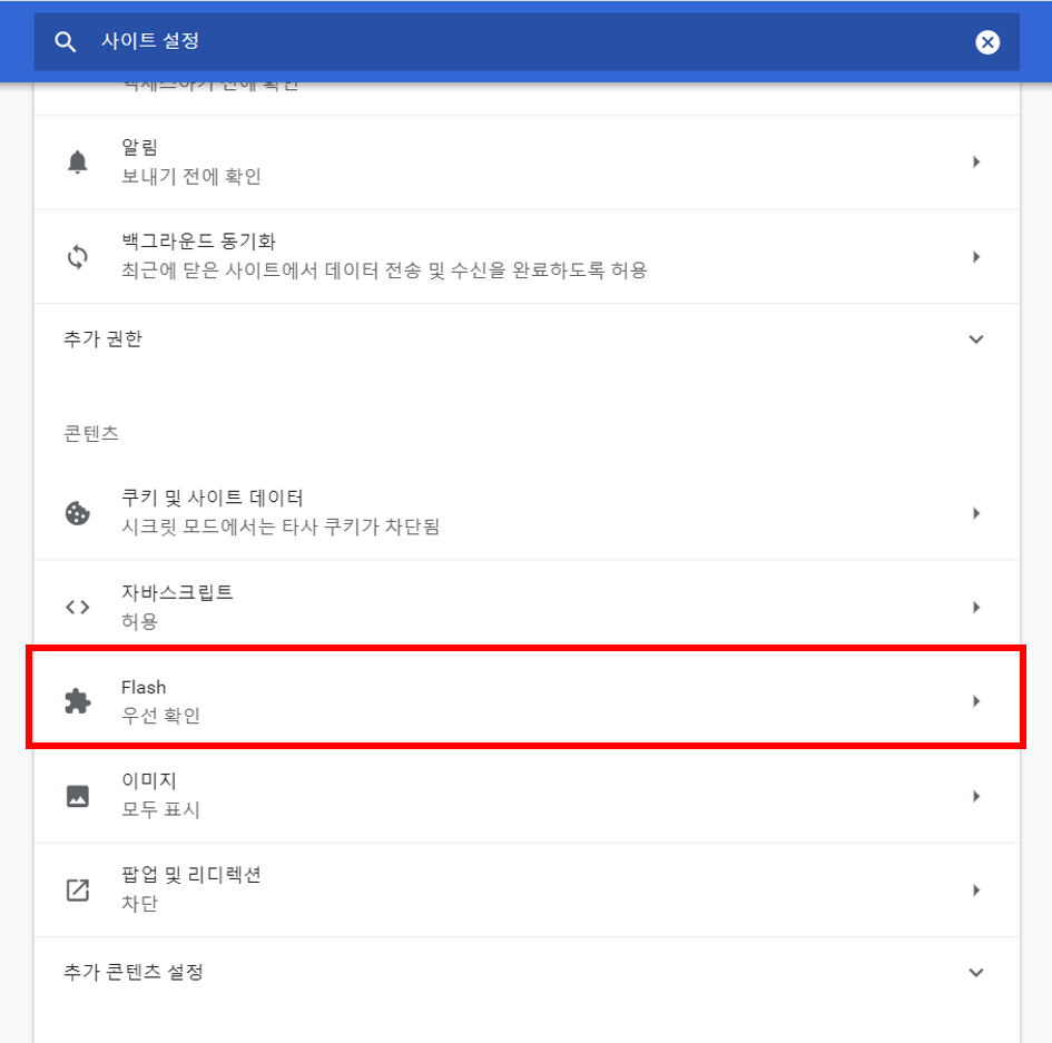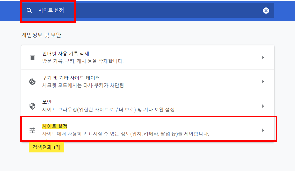 2. 검색창에 '사이트 설정' 검색 후 클릭